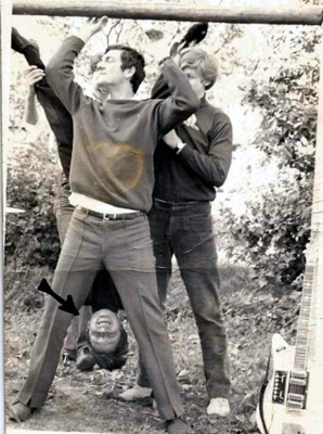 "BUTCHIES TUNE" etwa 1966, erste Photosession in der Urbesetzung: Vorne Schlagzeuger Hans Schwarz, rechts davon Gitarrist Gerhard Nasse, der Pfeil zeigt auf mich, hinten steht verdeckt Bassist Reinhard Dauerer und rechts lehnt meine EKO-Gitarre.
