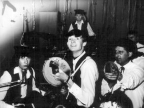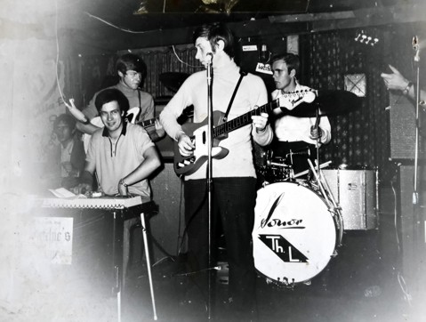 "THE RAMBLIN´ LAWYERS" Der allererste öffentliche Auftritt im Fasching 1965 im Theatersaal in Haar mit Roland Kastl am Schlagzeug, in der Mitte Rhythmusgitarrist Hans Lösch, nettererweise unterstützt ganz rechts von Ulli Olschewski am Tambourin, der uns bei seiner Combo "Red Devils" eine Einlage spielen ließ, und ich bin ganz links, was damals keineswegs politisch war! Bassist hatten wir noch keinen und es gibt auch leider keine Tondokumente, aber die Mädels, die uns damals immer in unserem Proberaum besucht haben, haben gesagt, dass wir fast so gut sind wie die Rolling Stones! (Das Foto habe ich freundlicherweise von Roland Kastl bekommen.)